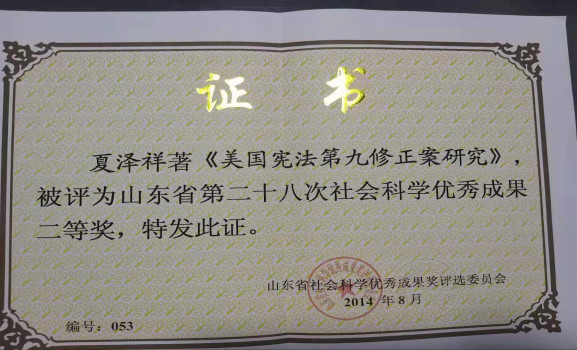 夏泽祥教授著《美国宪法第九修正案研究》被评为山东省第二十八届社会科学优秀成果二等奖