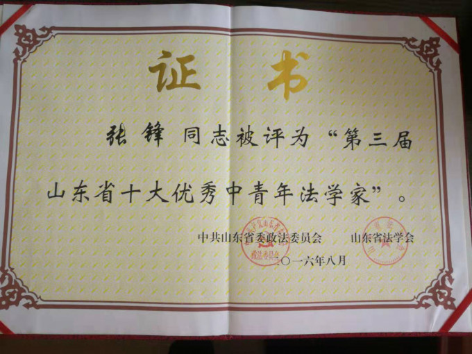 我院张锋教授获得“第三届山东省十大优秀中青年法学家”称号